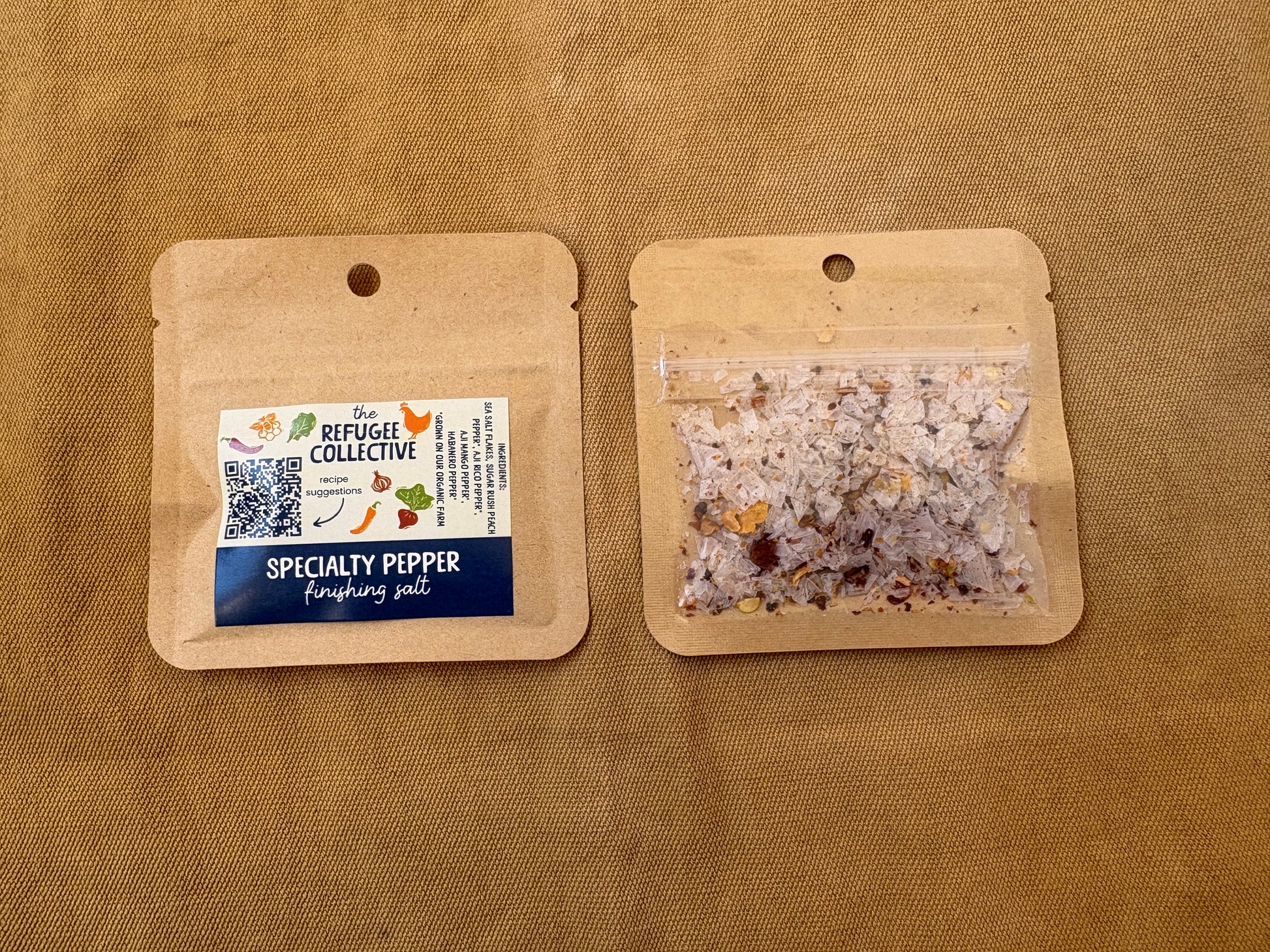 The Sampler Seasoning Gift Box includes seven seasoning blends inspired by our refugee team members and a finishing salt all using fresh organic peppers grown at our farm and dehydrated by our team in our food processing trailer. It also includes a hand block printed card, naturally dyed Texas organic tea towel made by our refugee artisan team, Texas Roselle harvested by our refugee farm team, and local honey. Each box comes with an impact card, information on all of the products, recipe suggestions for each seasoning packet, and the Refugee Collective sticker.