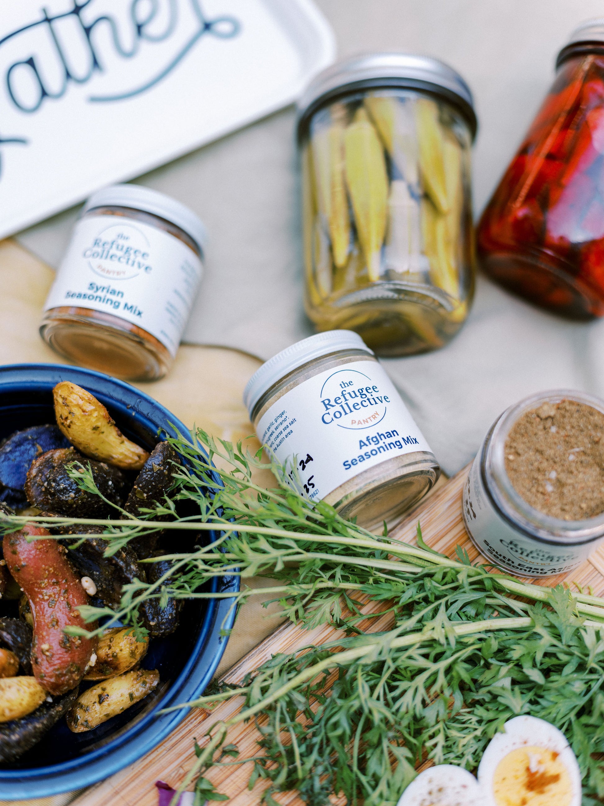 Inspired by the home flavors of our resettled refugee team, each jar is hand mixed and poured with care.