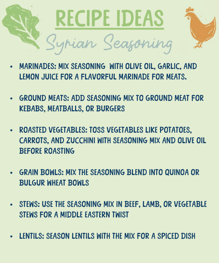 - Syrian Seasoning Mix: Ingredients: smoked paprika, cumin, black pepper, coriander, nutmeg, cinnamon, jalapeno*, cardamom, clove, coarse sea salt *grown on our farm